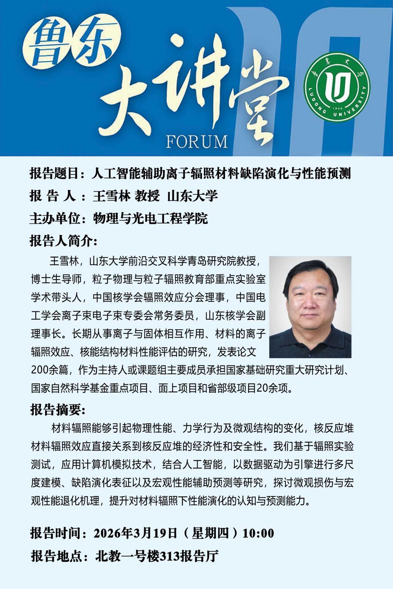 鲁东大讲堂|物理与光电工程学院:人工智能辅助离子辐照材料缺陷演化与性能预测