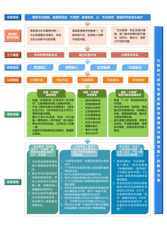 当今世界正经历百年未有之大变局,中华民族伟大复兴进入关键时期。新时代高校研究生教育必须回答好“培养什么人、怎样培养人、为谁培养人”这个根本问题,帮助青年学子在风云变幻的国际环境中增强文化自觉和文化自信,在全球人才竞争中彰显中国制度和中国文化优势,为全球高等教育贡献中国方案。 本项成果立足学校深厚的文化底蕴、鲜明的红色基因和长期以来的文化育人实践,面对世界百年未有之大变局和中华民族伟大复兴战略全局,在国内高校中首次提出“文化思政”育人理念,紧扣中华优秀传统文化、地方红色文化、大学学术文化“三个维度”,通过资源融汇、课程融入、实践融通、机制融合“四条途径”,锚定价值引领、专业养成、实践创新、社会担当、文化自信“五项赋能”,以“文化思政”育人体系创新研究生培养体系,拓展和深化“大思政”教育体系,全面提升文化育人成效。 成果聚焦文化赋能,突出文化浸润,通过完善“大思政”教学体系、创新“大实践”研学体系、强化“大师资”等多元联动保障体系,引导研究生以文化自信筑牢学术根基、以学术创新回应时代命题、以知行合一践行社会担当,为新时代研究生思政教育改革提供可复制推广的解决方案。成果将习近平文化思想融入高校育人体系,拓展和深化了“大思政”教育的文化维度,形成了“三维四融五赋能”文化育人范式,取得了文化赋能思政教育的显著成效,相关成果和经验做法被《中国教育报》《新华网》《中国社会科学网》等多家权威媒体发表和报道。详情>>